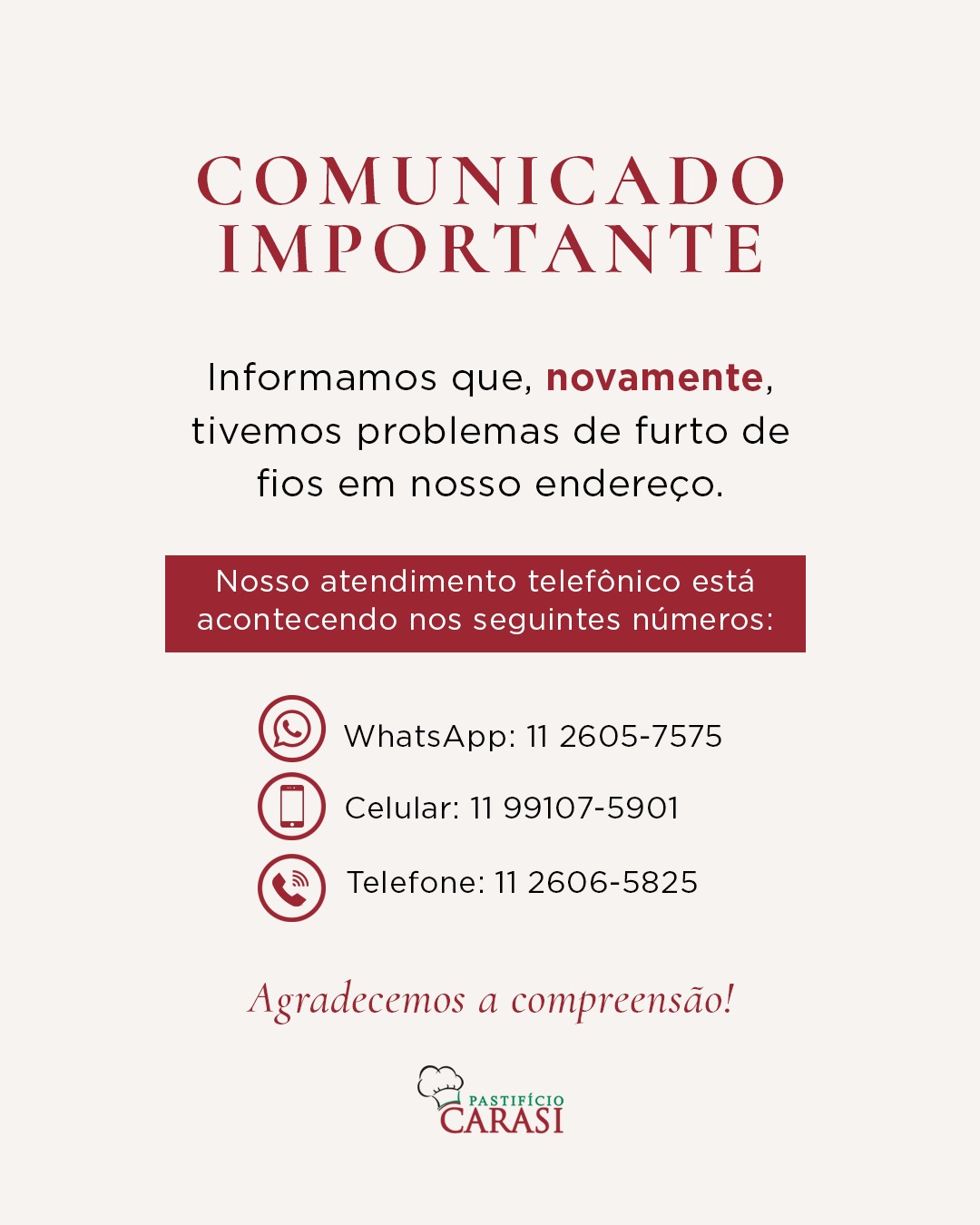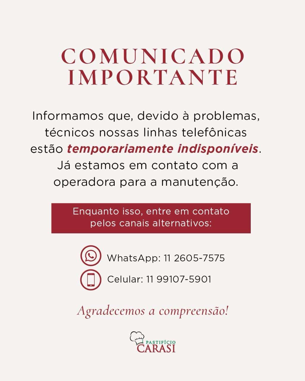 Agradecemos a compreensão e solicitamos que as encomendas sejam feitas através do nosso Whattsapp ou pelo nosso celular temporário (11) 99107-5901.